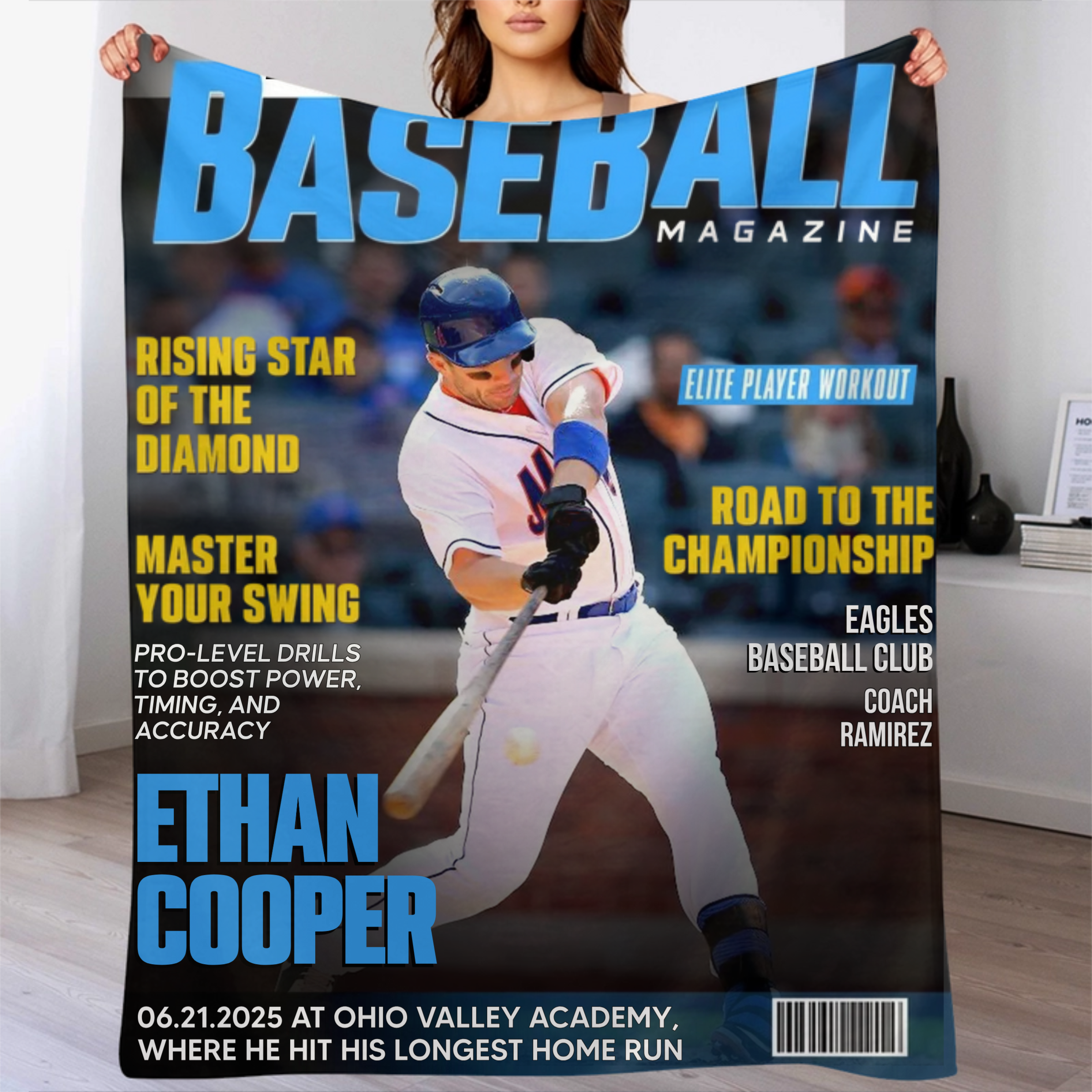Turn their baseball story into a front-page treasure with thisĀ Personalized Baseball Magazine Cover Blanket! ā¾š Designed like a classic sports magazine, it can be customized with a player's photo, name, headline, and even stats or a memorable quote.