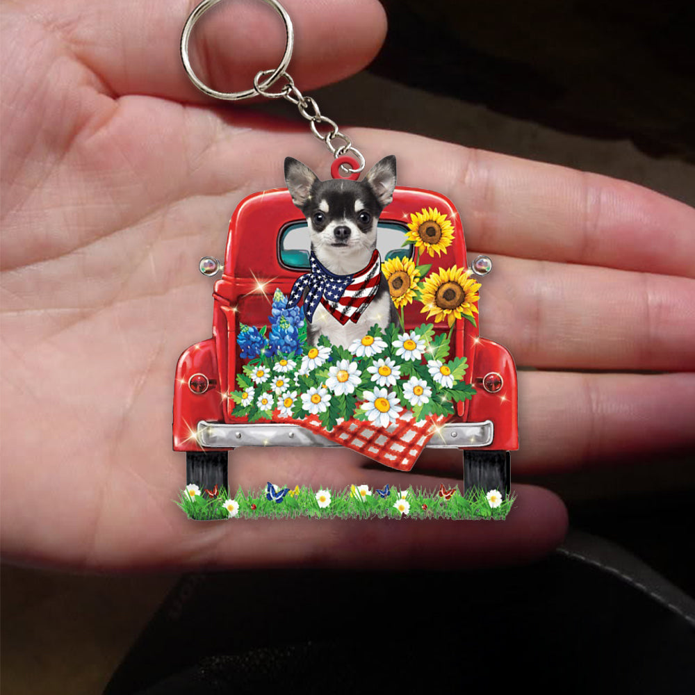 BLACK Chihuahua-Red Truck Flat Acrylic Keychain