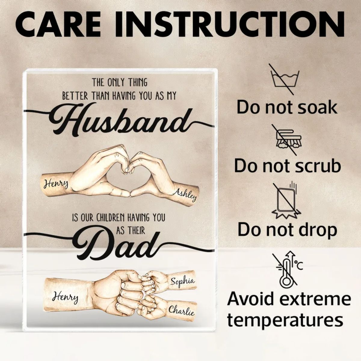 From holding tiny newborn fingers to fixing broken bike chains, his hands have built memories, wiped tears, and held your family together. Now, honor those hands—forever preserved in a glowing acrylic block, etched with your most cherished words.💞
